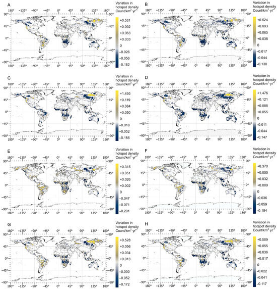 Variation in hotspot density during COVID-19 (Anomalies compared to the 5-year pre-pandemic period, (A): 2020, (C): 2021, (E): 2022, (G): 3-year pandemic average; anomalies compared to the 10-year pre-pandemic period, (B): 2020, (D): 2021, (F): 2022, (H): 3-year pandemic average).