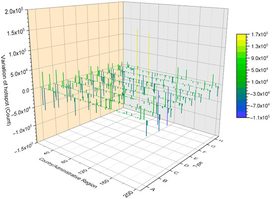 In 2020, our analysis revealed significant spatial heterogeneity in hotspot changes across 206 countries/administrative regions compared to the pre-pandemic period (2015–2019) (Figure 4A,B). Notably, 94 regions exhibited positive hotspot changes (>0) (Figure 5A), including eight regions with substantial increases exceeding 10,000 hotspots, where Russia demonstrated the most pronounced increase (59,990) (Figure 4A). Conversely, 91 regions showed negative hotspot changes (<0) (Figure 5A), with nine regions experiencing decreases greater than 10,000, among which Australia showed the most significant reduction (−60,380). Twenty-one regions maintained stable hotspot levels without observable changes (Figure 4A).
