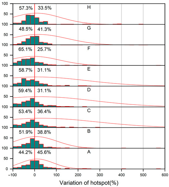 A comprehensive analysis of all eight scenarios revealed consistent patterns: in seven out of eight scenarios (excluding scenario a), regions with negative hotspot change rates significantly outnumbered those with positive changes. The most pronounced disparity occurred in scenario F. Across all scenarios, the majority of regions (countries/administrative regions) exhibited hotspot change rates within the −20% to 20% range (Figure 5).