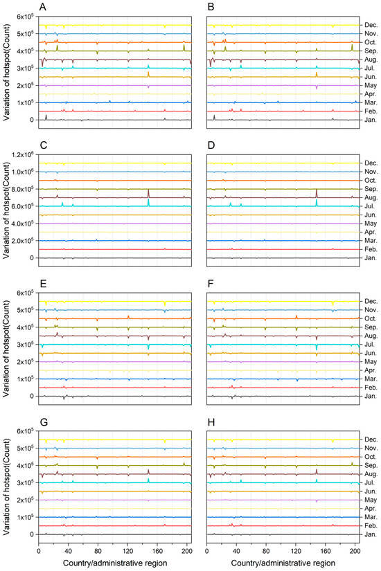 Monthly comparison of hot spot changes in different countries/administrative regions (Anomalies compared to the 5-year pre-pandemic period, (A): 2020, (C): 2021, (E): 2022, (G): 3-year pandemic average; anomalies compared to the 10-year pre-pandemic period, (B): 2020, (D): 2021, (F): 2022, (H): 3-year pandemic average).