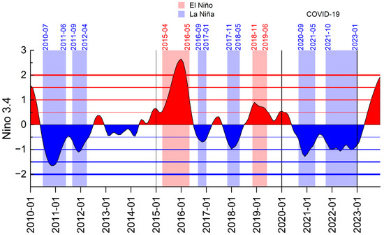 The COVID-19 period is defined as the three-year span from 2020 to 2022, while the pre-COVID-19 five-year period covers 2015–2019, and the pre-COVID-19 decade includes 2010–2019. The following eight epidemic scenarios are defined: (A) the anomaly between 2020 and the pre-COVID-19 five years; (B) the anomaly between 2020 and the pre-COVID-19 decade; (C) the anomaly between 2021 and the pre-COVID-19 five years; (D) the anomaly between 2021 and the pre-COVID-19 decade; (E) the anomaly between 2022 and the pre-COVID-19 five years; (F) the anomaly between 2022 and the pre-COVID-19 decade; (G) the anomaly between the mean of the COVID-19 period and the pre-COVID-19 five years; and (H) the anomaly between the mean of the COVID-19 period and the pre-COVID-19 decade. Origin 2024 was used to analyze and plot the distribution of hotspots in years, months, continents, and countries/administrative regions before and after the COVID-19 incidents, quantifying the changes in the number of hotspots in each country/administrative region under the eight scenarios. An El Niño (or La Niña) event is defined as the 3-month moving average of the Niño 3.4 index being > 0.5 (<−0.5) and lasting for at least 5 months. Arcis Pro 3.0 was used to analyze and plot the distribution of hotspot density in each country/administrative region under the eight scenarios.