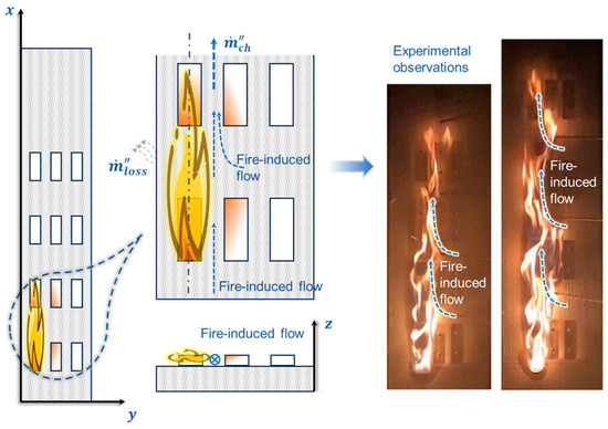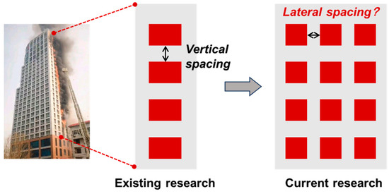 Existing research [19,20,21,22] has provided substantial theoretical guidance for the implementation of vertical fire barriers. However, Zhang et al. [23] noted that inadequate vertical spacing could fail to prevent fire spread effectively and may even enhance fire growth due to induced air entrainment. In contrast to extensive studies on vertical spacing effects, systematic investigations regarding lateral spacing within façade fuel matrices remain limited. In real fire scenarios, as illustrated in Figure 1, the distribution of combustibles tends to form a two-dimensional fuel matrix, rather than the tree-like fuel element arrays commonly adopted in previous studies on forest fire investigations [24,25,26,27]. In contrast, our study examines compact fuel arrays that simulate realistic building façade configurations. Moreover, the depicted fire accident suggests that laterally spaced fire barriers may offer improved effectiveness in impeding flame spread across the façade compared with relying solely on vertical separations. Therefore, exploring the influence of lateral spacing is particularly important for advancing façade fire protection strategies.