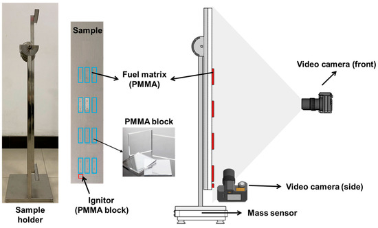 The experimental setup used to investigate concurrent flame spread over discrete PMMA fuel surfaces is illustrated in Figure 2. It comprises three main components as follows: a PMMA fuel matrix module, a vertical sample holder, and a steel base. The fuel matrix consists of multiple standardized PMMA blocks (8 cm × 3 cm × 1 cm) mounted on a fire-resistant alumina-silicate ceramic backing plate (120 cm × 20 cm × 2 cm). Positioned at the bottom-left corner of the PMMA array, 1 cm below the first PMMA block, was an ignition block with dimensions identical in width and thickness to the fuel panels but with a length of 1 cm. This ignition block was intended to uniformly preheat the PMMA fuel matrix above and minimize interference from the ignition process on subsequent flame spread dynamics.