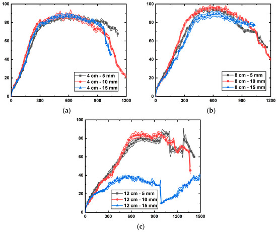 Flame height in fuel matrices not only reflects the scale and energy release of a fire but also directly impacts critical factors such as heat radiation, combustion product emissions, and gas flow dynamics. Hence, accurate measurement and understanding of flame height are essential for effectively managing fire risks. In this study, flame height is defined as the vertical linear distance from the base to the tip of the flame, determined accurately using the image recognition and processing methods mentioned in Section 2. Figure 3 illustrates the temporal evolution of flame height for various fuel matrix configurations, labeled in the format “vertical spacing–lateral spacing” (e.g., “4 cm–5 mm” indicates a fuel matrix with 4 cm vertical spacing and 5 mm lateral spacing).