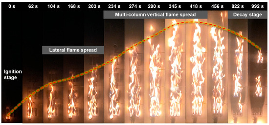 This subsection further presents the flame morphology observed on the surface of the fuel matrix. These images, captured by a high-definition camera positioned in front of the experimental setup, provide a direct visualization of the influence of lateral spacing on flame propagation paths. Figure 4 shows the temporal evolution of flame morphology for a fuel matrix configuration with a lateral spacing of 5 mm and a vertical spacing of 8 cm. Approximately 104 s after ignition of the bottom fuel element in the first column, the flame propagated across the 5 mm lateral spacing and ignited the bottom fuel element in the second column. Following the merging of flames from these two columns, the flame intensity increased significantly, resulting in the near-simultaneous ignition of the bottom fuel element in the third column and the second-layer element in the first column. Subsequently, the integrated flames from all three columns expanded in volume, accelerating the ignition of the upper fuel elements and forming a rapid vertical propagation across multiple columns. Specifically, the second, third, and fourth fuel layers were ignited sequentially at approximately 234 s, 274 s, and 290 s, respectively. The flame height then rapidly reached its peak, remained stable for a period, and gradually decreased as the lower fuel was consumed. These observations indicate that the small lateral spacing (5 mm) allowed the flame to readily traverse the lateral gaps, enabling early horizontal propagation followed by swift vertical spread.
