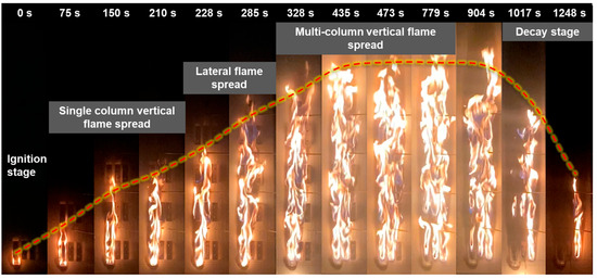 As shown in Figure 5, when the lateral spacing increased to 10 mm, the expanded spacing reduced the efficiency of heat transfer between adjacent fuel elements. Flame propagation initially exhibited a predominant vertical trend, reaching the third-layer fuel element in the first column at approximately 210 s. During this vertical development, the flame intensity gradually increased. Around 228 s, the flame crossed the lateral gap and ignited the second column, marking the onset of lateral spread. The flames from the second and third columns then propagated vertically and merged with the original flame, further enhancing flame height and resulting in a rapid vertical spread across multiple columns. At approximately 473 s, the intensified flame ignited the fourth-layer fuel, reaching the peak flame height, which subsequently declined as the lower fuel layers were burned out.