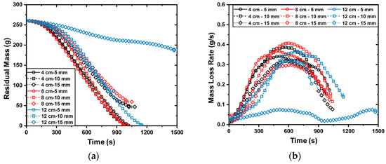 The burning rate is a key indicator for evaluating the energy release rate of solid fuels. A higher burning rate implies that the fuel can rapidly release a large amount of energy, potentially accelerating fire spread. In this study, fuel mass variations over time were recorded using a mass sensor (see Section 2). By comparing the initial mass before combustion with the residual mass after combustion, the burning rates of the fuel matrices were determined. Figure 7 presents the recorded variations in fuel mass and mass loss rate for different fuel matrix configurations. All data points shown represent the mean values obtained from repeated experiments, and the maximum variation observed across repetitions did not exceed 12.7%.