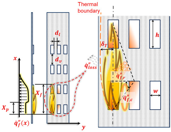 Figure 8 illustrates the principal heat transfer processes involved in flame spread across the fuel matrix. Energy released by the initial flame combustion is transferred to adjacent lateral fuels through radiative heat flux and convective heat flux . Concurrently, a portion of this energy dissipates into the ambient environment at vertical spacing intervals, denoted as . Additionally, a minor quantity of energy is conducted to the fireproof backing plate; however, this conductive loss is negligible due to the low thermal conductivity of the backing plate material.