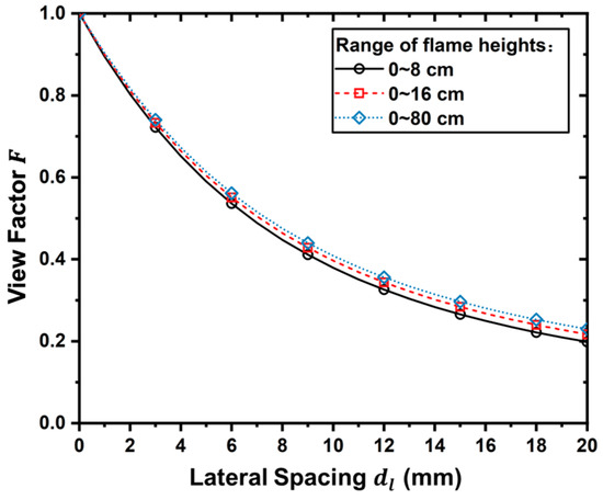 For the ignition of lateral fuel elements, radiative heat from the initial flame primarily impacts the lateral fuel surfaces [37]. Within the flame height range of 0 to 8 cm, the flame surface projection overlaps considerably with the lateral fuel surfaces, making the view factor significantly influential in the radiative heat flux calculations. As the flame height increases beyond this initial range, the extent of overlap between the flame and lateral fuel surfaces gradually diminishes, resulting in a decreasing sensitivity of the view factor to further increases in flame height. To assess this quantitatively, hand calculations using Equations (2) and (3) were conducted based on flame heights typically exceeding 16 cm, a condition representative of fully-developed burning phases observed in our experiments. The results presented in Figure 9 clearly indicate that when flame heights surpass approximately 16 cm, the sensitivity of the view factor to flame height variations becomes minimal. Therefore, for simplicity and reproducibility, the view factor values corresponding to the blue dash curve in Figure 9 were adopted in our calculations.