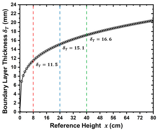 Using the parameters listed in Table 2, calculations via Equations (10) and (11) yield results as illustrated in Figure 10. According to these experimental findings, the thickness of the thermal boundary layer at the surface of the initial fuel block (at a reference height of 8 cm) is approximately 11.5 mm. This indicates significant convective heat transfer effects during the ignition of lateral fuels at lateral spacings of 5 mm and 10 mm.