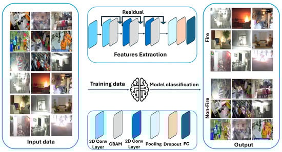 - Design of an enhanced fire detection model, based on the mixed convolution ResNets (MC3_18) architecture augmented with Convolutional Block Attention Modules (CBAM), to improve early-stage fire recognition by emphasizing salient spatiotemporal features.