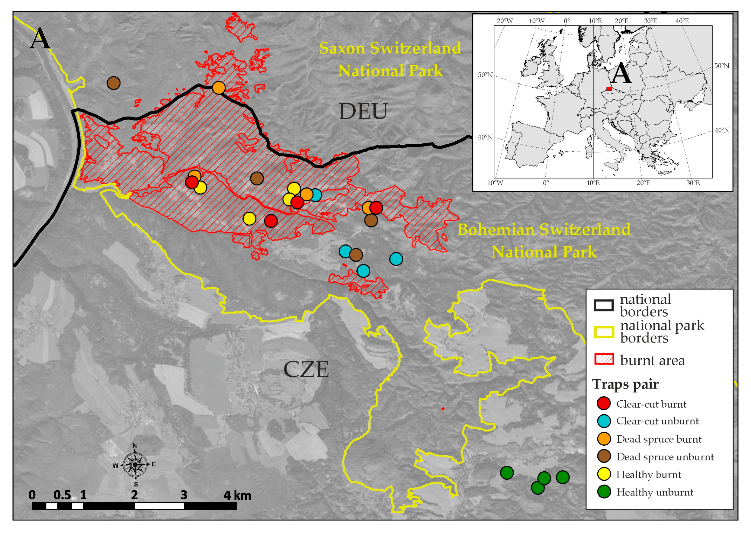 - Zumr, V.; Remeš, J.; Nakládal, O. Short-Term Response of Ground Beetles (Coleoptera: Carabidae) to Fire in Formerly Managed Coniferous Forest in Central Europe. Fire 2024, 7, 76. [Google Scholar] [CrossRef]