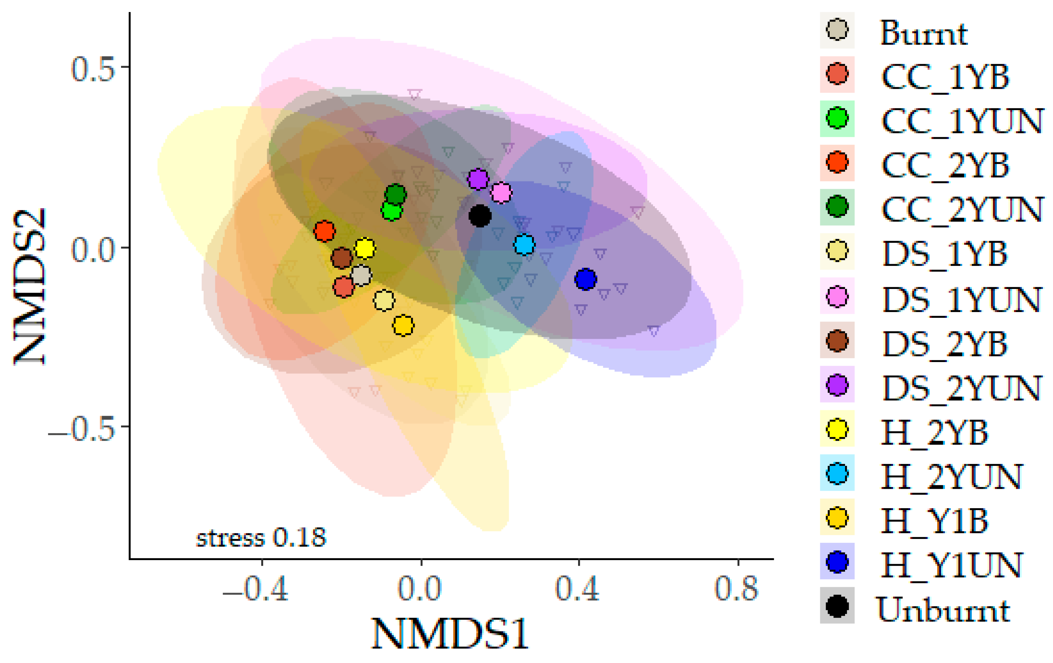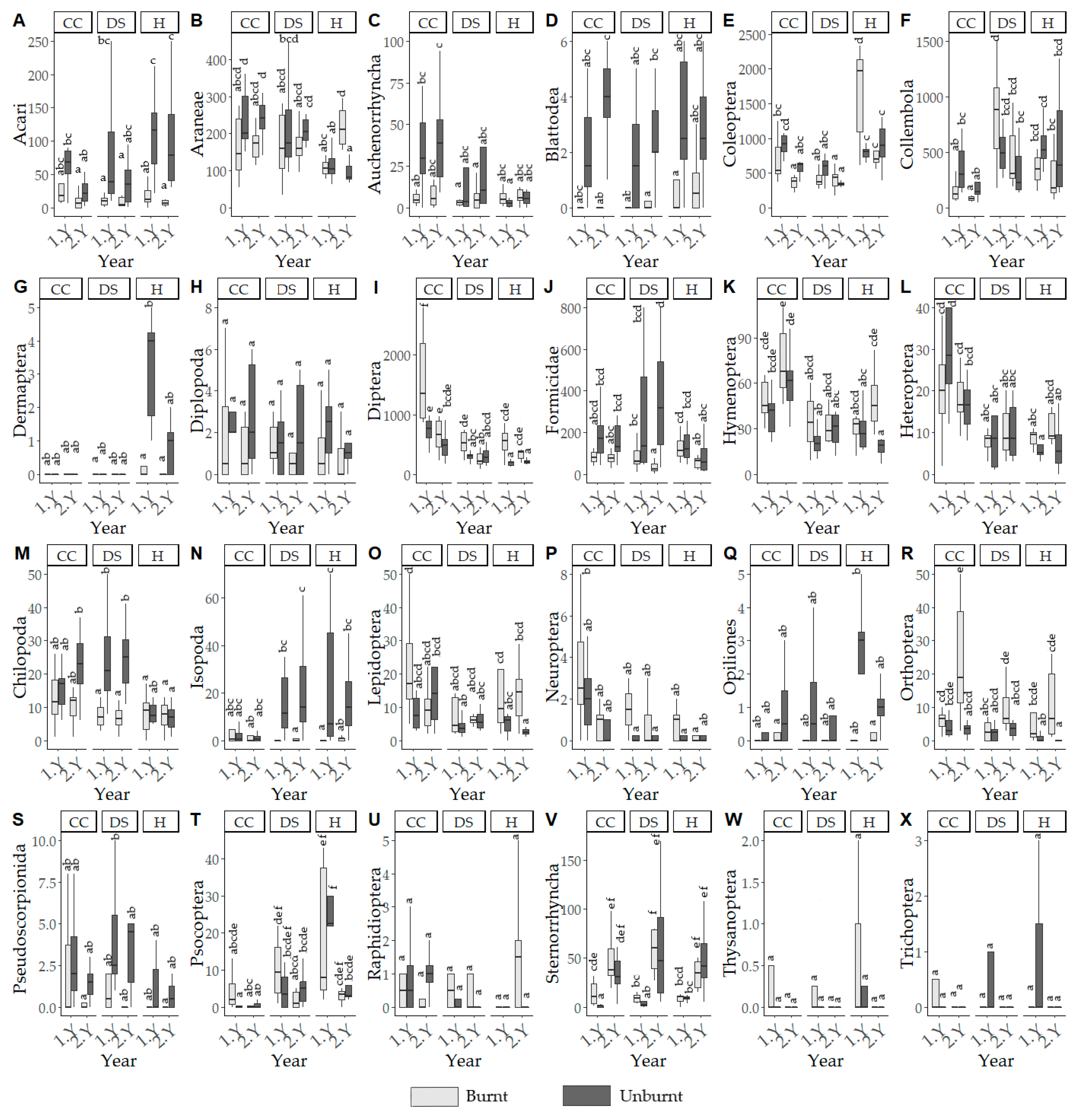 - Malmström, A.; Persson, T.; Ahlström, K.; Gongalsky, K.B.; Bengtsson, J. Dynamics of Soil Meso- and Macrofauna during a 5-Year Period after Clear-Cut Burning in a Boreal Forest. Appl. Soil Ecol. 2009, 43, 61–74. [Google Scholar] [CrossRef]