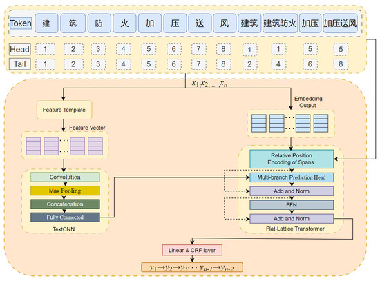 Firstly, we introduce FT-FLAT (Feature Template TextCNN–Flat-Lattice Transformer), based on a hybrid CNN–Transformer architecture, for identifying fire safety standard entities. To better capture positional relationships and feature patterns, we introduce a Relative Position Embedding (RPE) mechanism. The model employs a Multi-Branch Prediction Head (MBPH) to enhance the multi-scale feature learning and hierarchical representation.