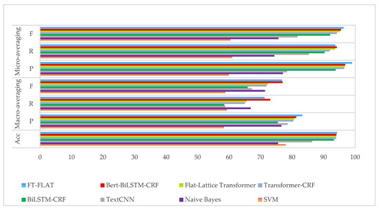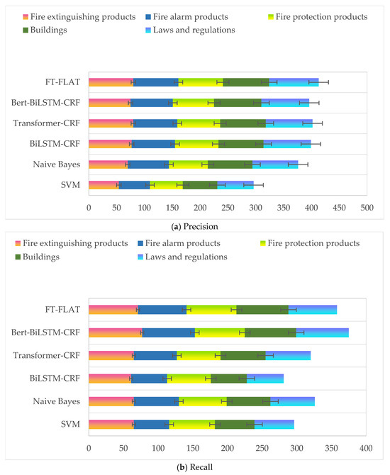 To evaluate the performance of the fire safety standard entity recognition model based on FT-FLAT, experiments were conducted in this section and compared with different algorithm models. The comparison models included SVM [34], Naive Bayes [35], TextCNN [36], BiLSTM-CRF [37], Transformer-CRF [38], Flat-Lattice Transformer [39], Bert-BiLSTM-CRF [40], and the deep learning model based on FT-FLAT proposed in this paper. All the models were trained and validated on the same dataset. Throughout the experimental process, we focused on exploring the performance of different models in the task of fire safety standard entity recognition, with the aim of providing more effective solutions for this task. The goal was to reveal the advantages and limitations of the FT-FLAT model relative to traditional algorithm models and other deep learning models. During the training and validation phases, all the models were trained in the same environment to ensure the reliability and comparability of the evaluation results.