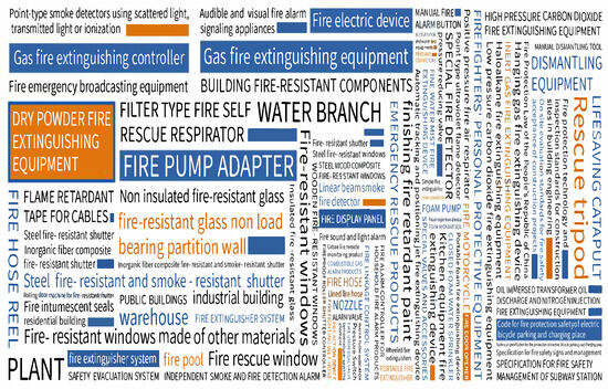 This paper trained a fire safety standard entity recognition model to extract fire safety standard entities from text data. Figure 5 shows the word cloud formed by the five categories of fire safety standard entities extracted.
