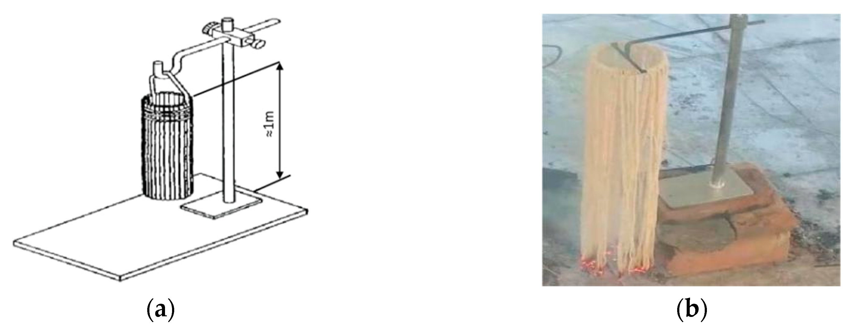 | Wood block smoldering | Beech stick (with a moisture content of approximately 5%) | 10 pieces, each with dimensions of 75 mm × 25 mm × 20 mm |