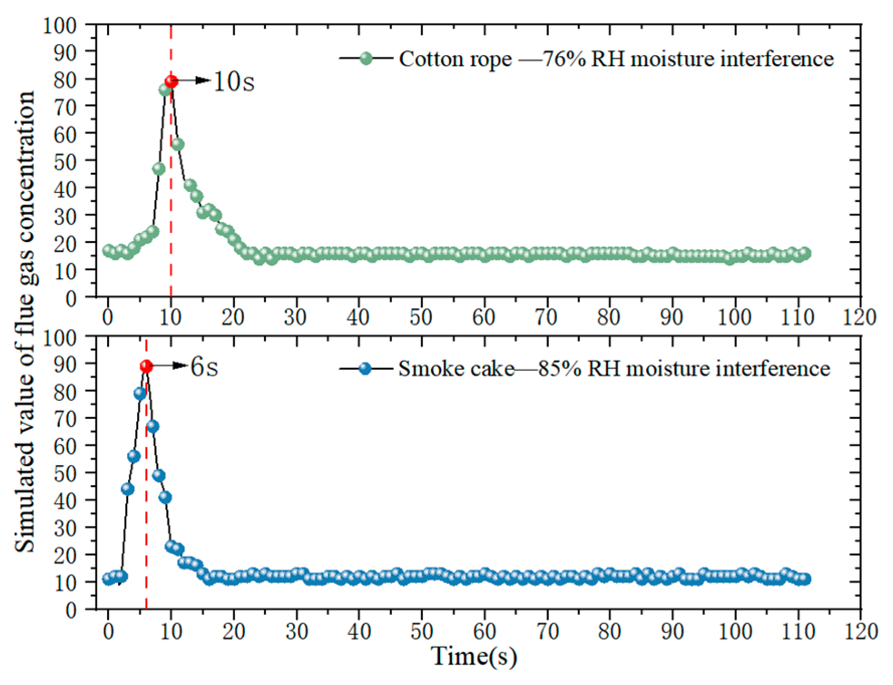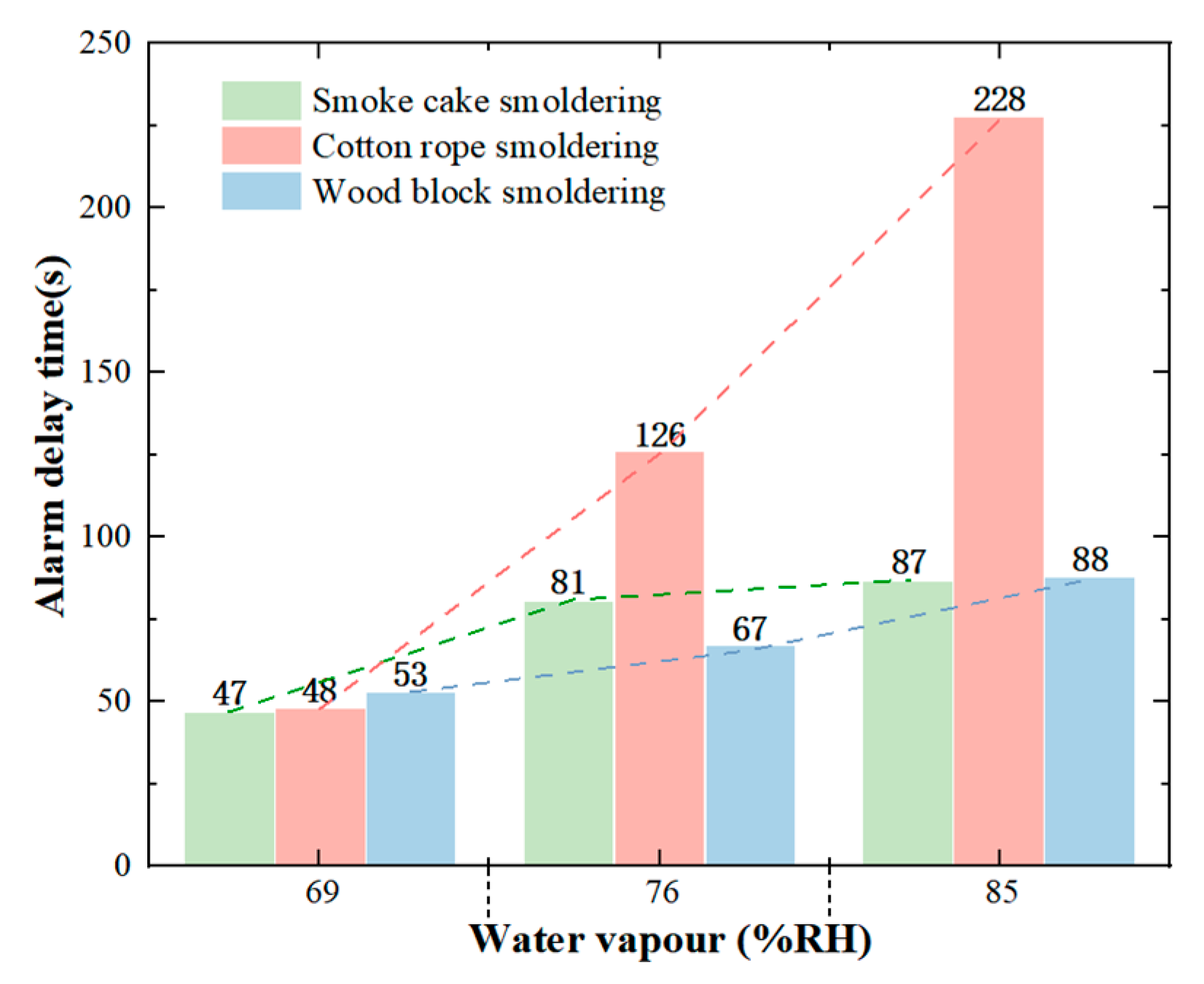- Under conditions of water vapor interference, the degree of impact of different interference gradient levels on the alarm delay time of three types of fire source condition detectors varies. The alarm delay times for the three types of fire source condition detectors are as follows: cotton rope smoldering (48–228 s) > wooden block smoldering (53–88 s) > smoke cake smoldering (47–87 s).
