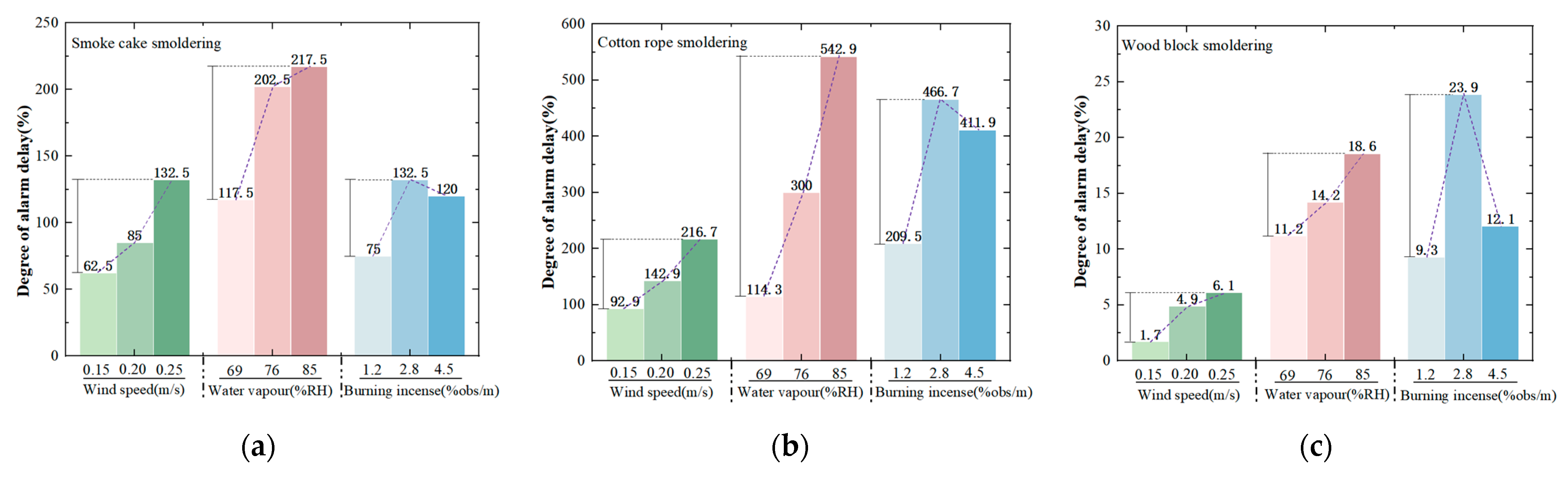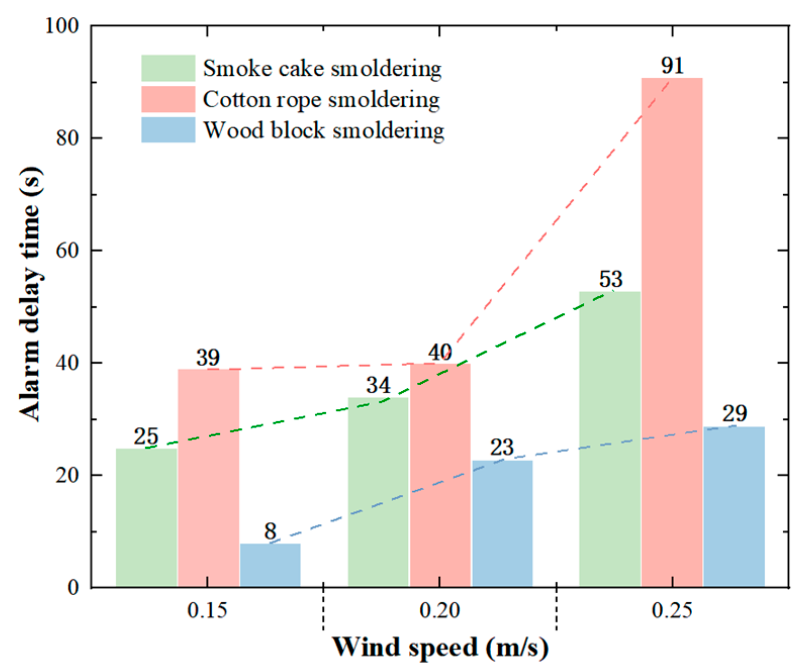 - In the case of smoldering conditions of the cotton rope, the alarm response time of fire detectors is significantly affected by various sources of interference. Among them, the influence of wind speed and water vapor interference conditions on the alarm delay time of the detector is significantly different. The impact of three interference conditions on the alarm time delay of the detector is as follows: water vapor interference > burning incense interference > wind speed interference.
