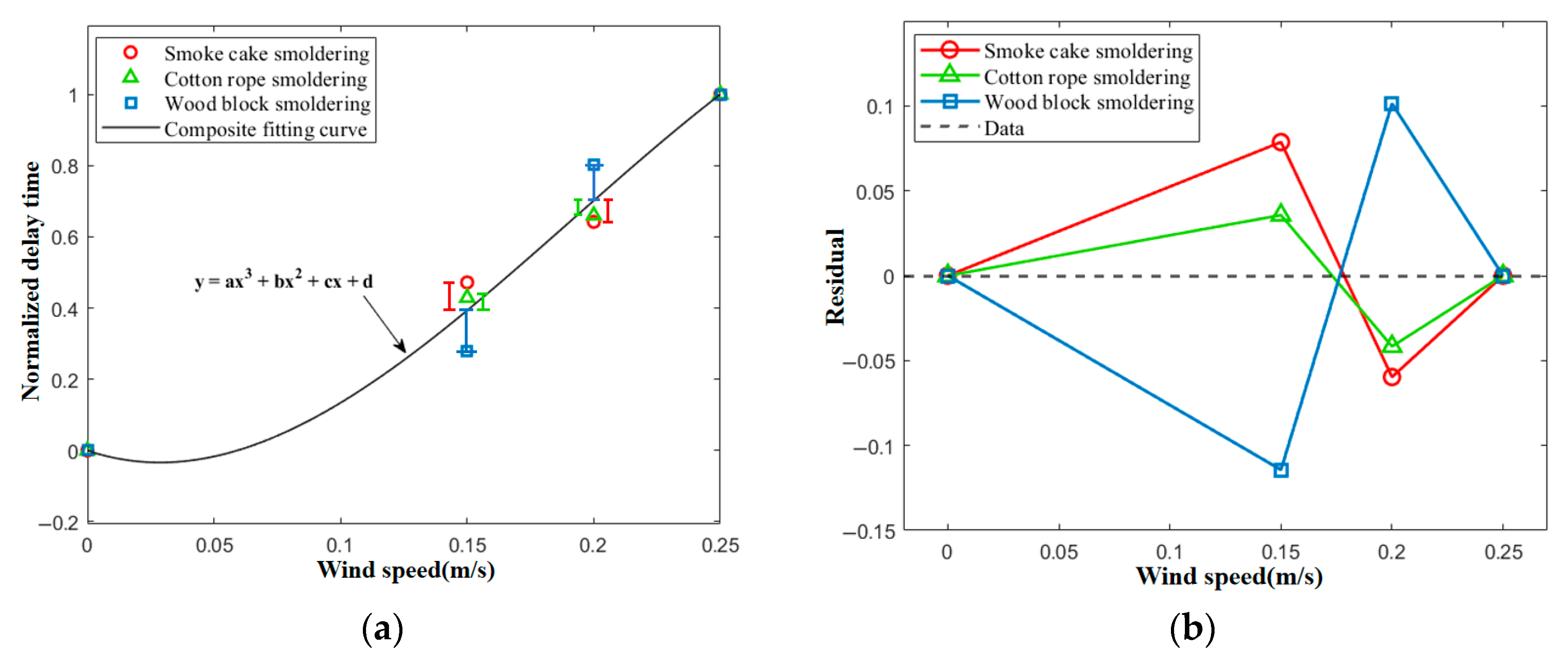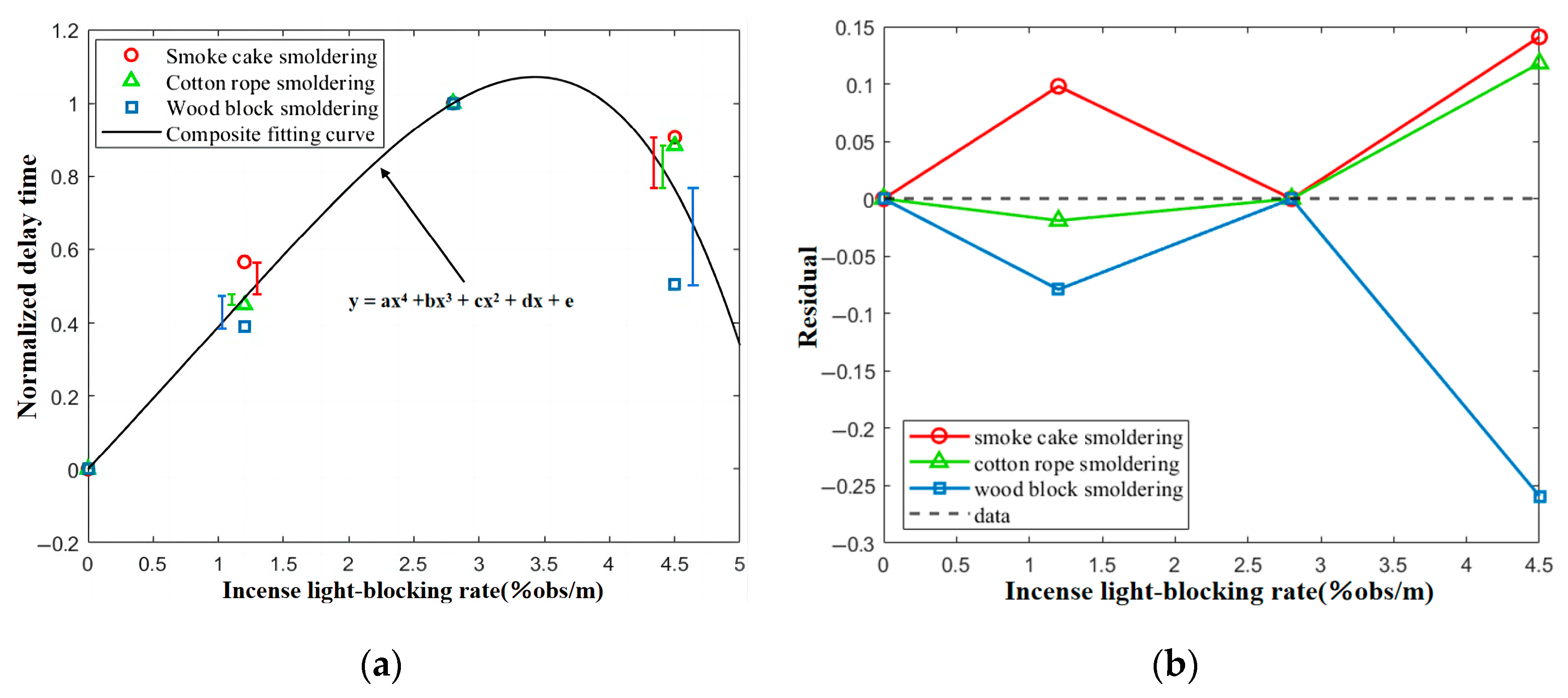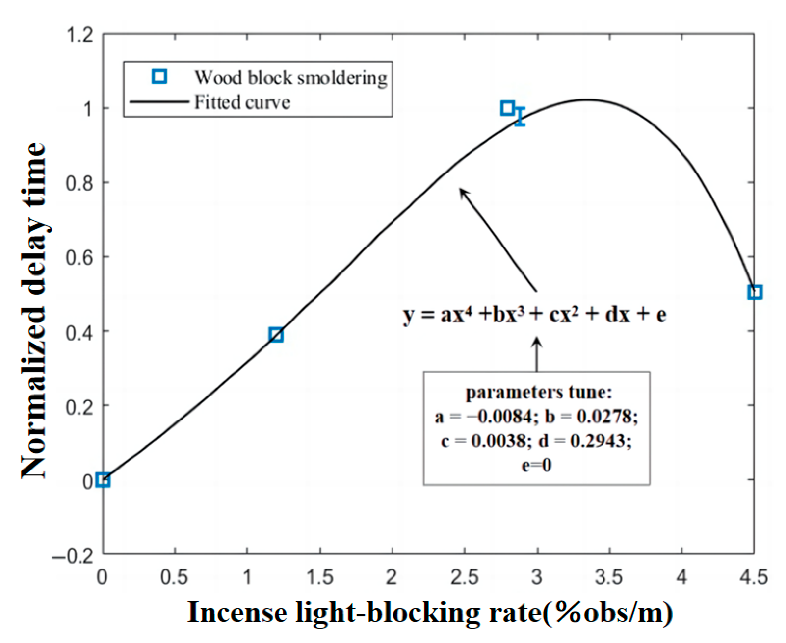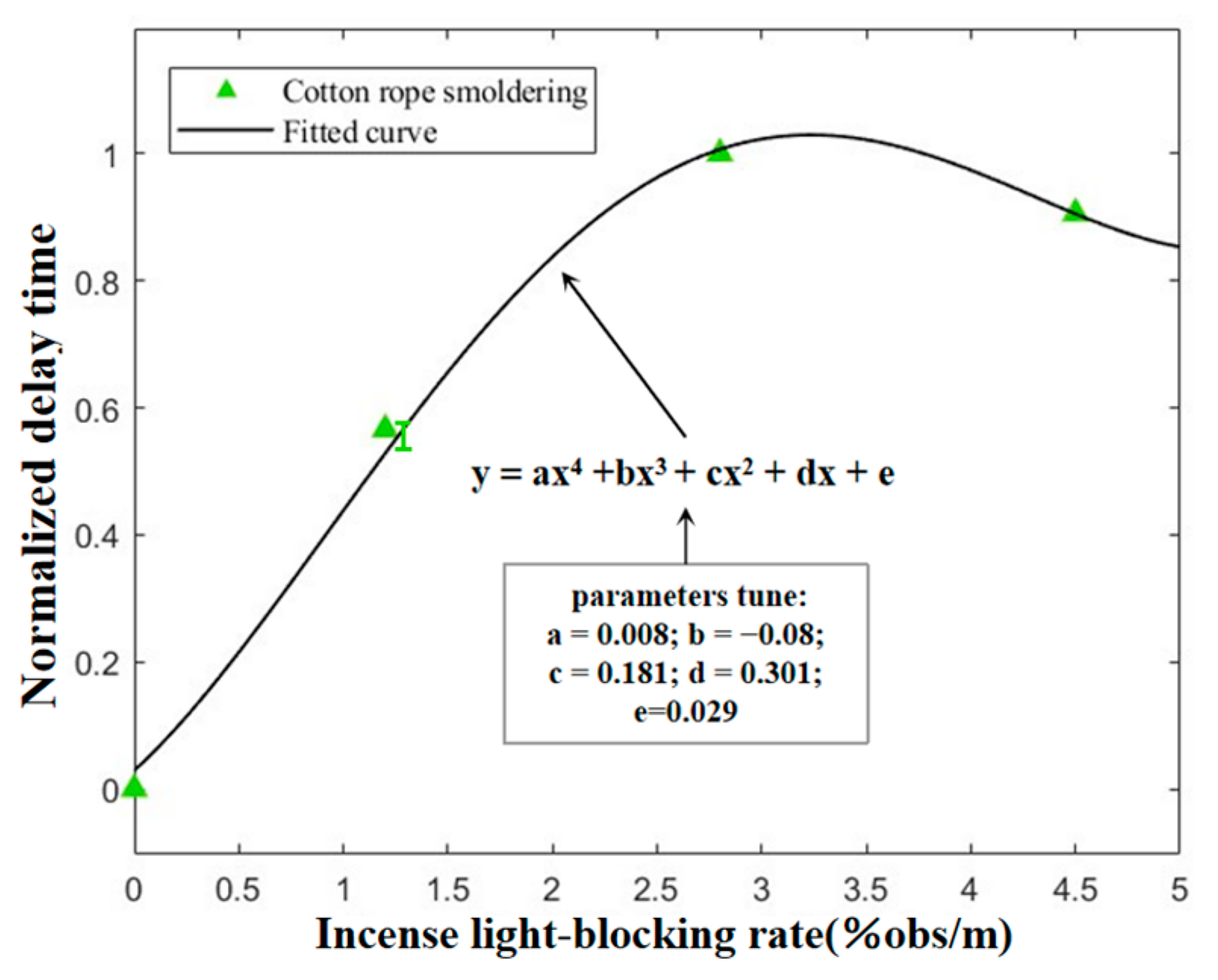 - Under the condition of burning incense interference, the fitted curve conforms to a fourth-order polynomial function (as in Formula (6)). Among them, the residuals of cotton rope smoldering and wood block smoldering conditions are relatively large. After parameter optimization and application, the prediction error under all conditions is controlled within 7.5 s.