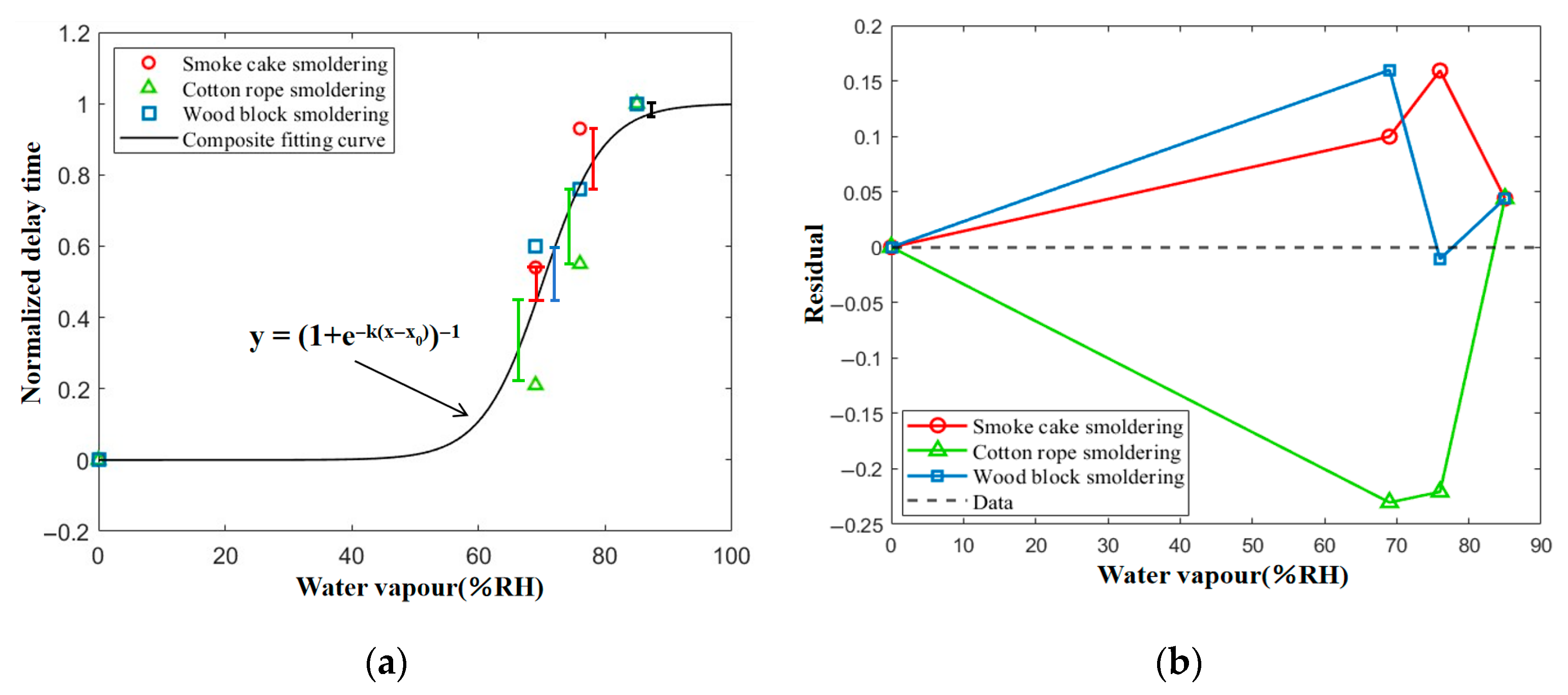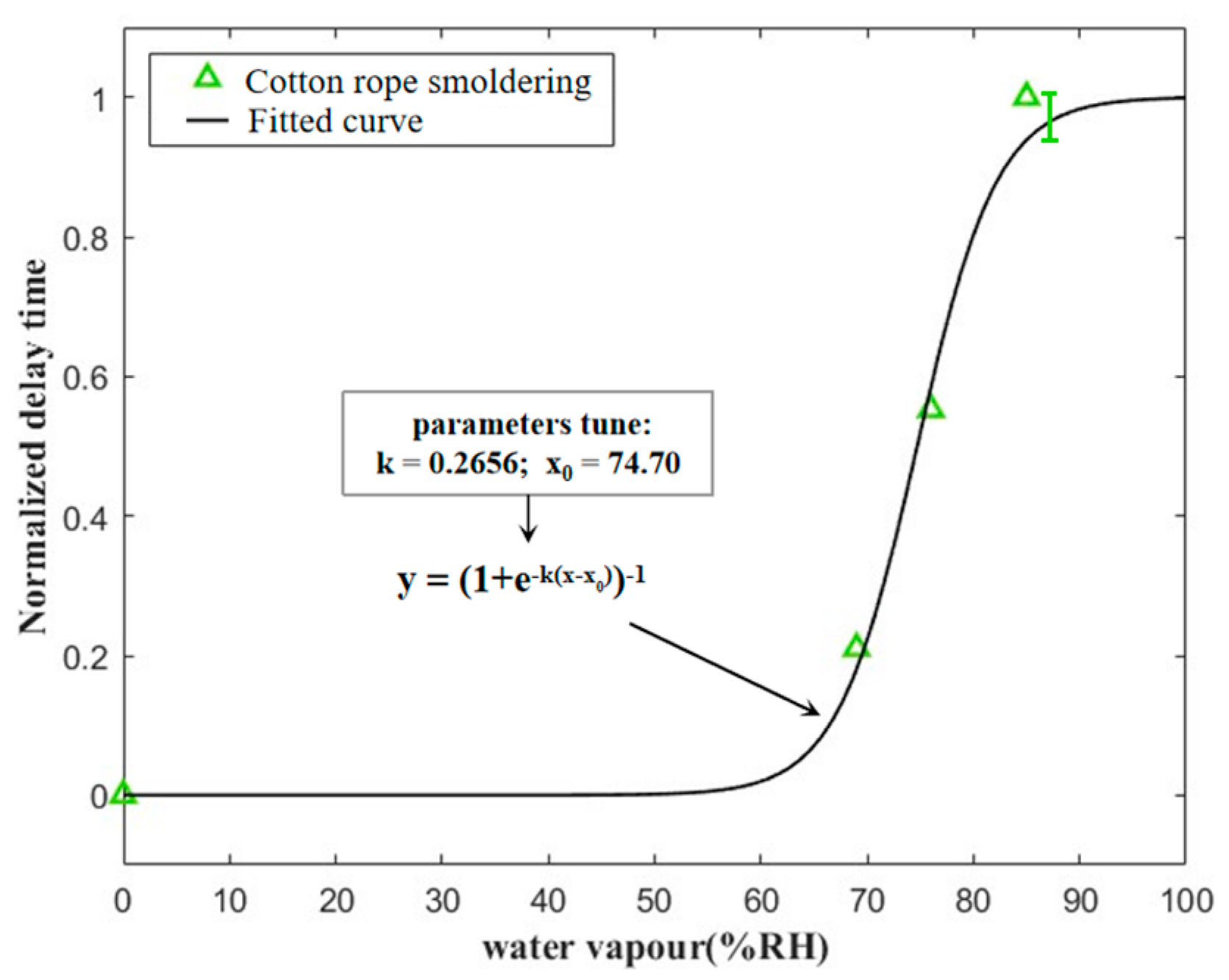 - Under the condition of water vapor interference, the fitted curve conforms to the Sigmoid function (as in Formula (5)). Among them, the fitting effect of cotton rope smoldering conditions was poor. Parameter optimization was carried out, and the prediction error under all conditions was ultimately controlled within 14 s.