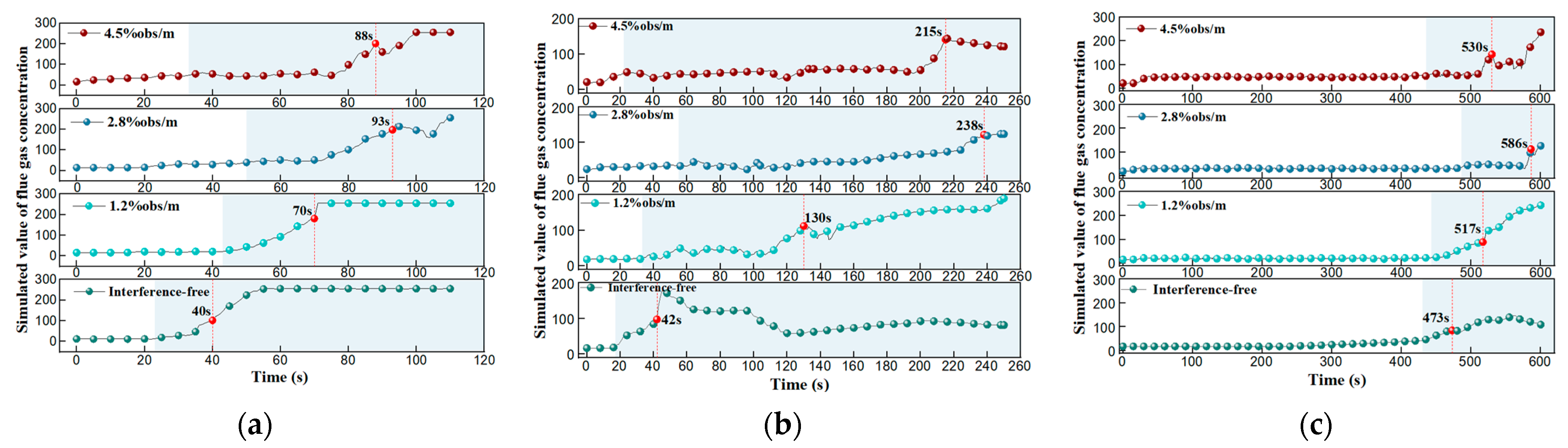 - Under typical interference conditions, the detector alarms may have false alarms. The overall accuracy rate of the detector alarms is approximately 97.8%. Apart from false alarms, in the three types of fire source conditions, the response characteristics of the initial increase in smoke concentration and the alarm delay time of the smoke detector are as follows: they show a nonlinear positive correlation with the increase in the wind speed and water vapor interference gradient, and they present a single-peak change characteristic with the increase in incense interference quantity.