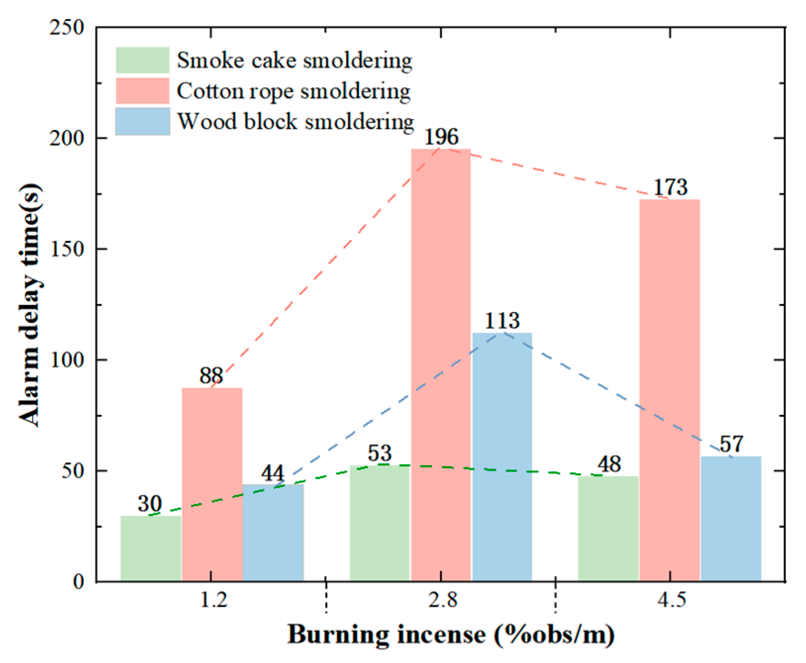 - Under burning incense interference conditions, there are significant differences in the alarm delay times of fire detectors under different fire source operating conditions. The alarm delay times for the three types of fire source condition detectors are as follows: cotton rope smoldering (88–196 s) > wood block smoldering (44–113 s) > smoke cake smoldering (30–53 s).