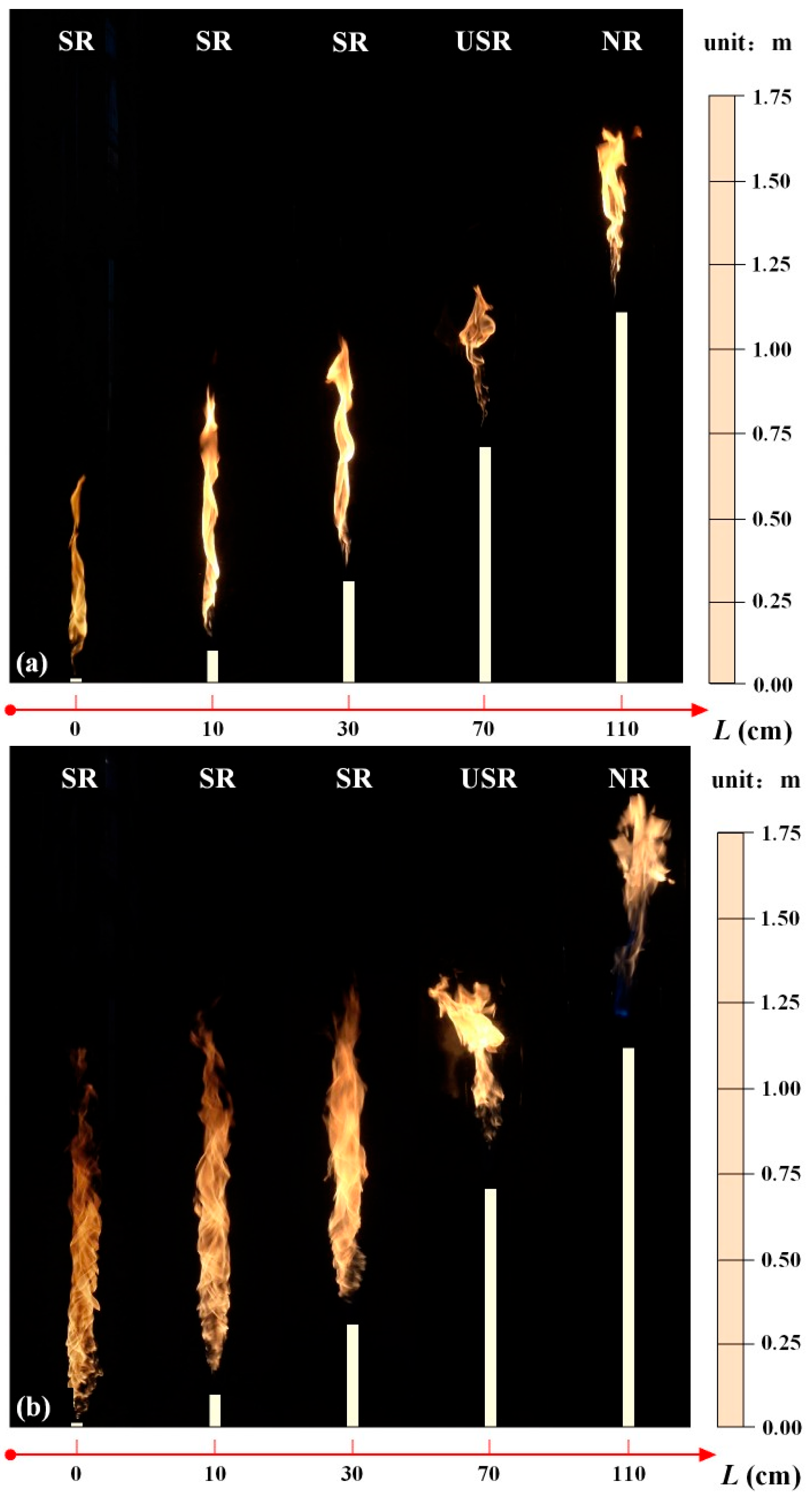 - As the nozzle height increases, the interaction between the burning flame and vortex flow reduces in strength, as evidenced by the sequential transition of flame states from SR to USR and ultimately to NR.