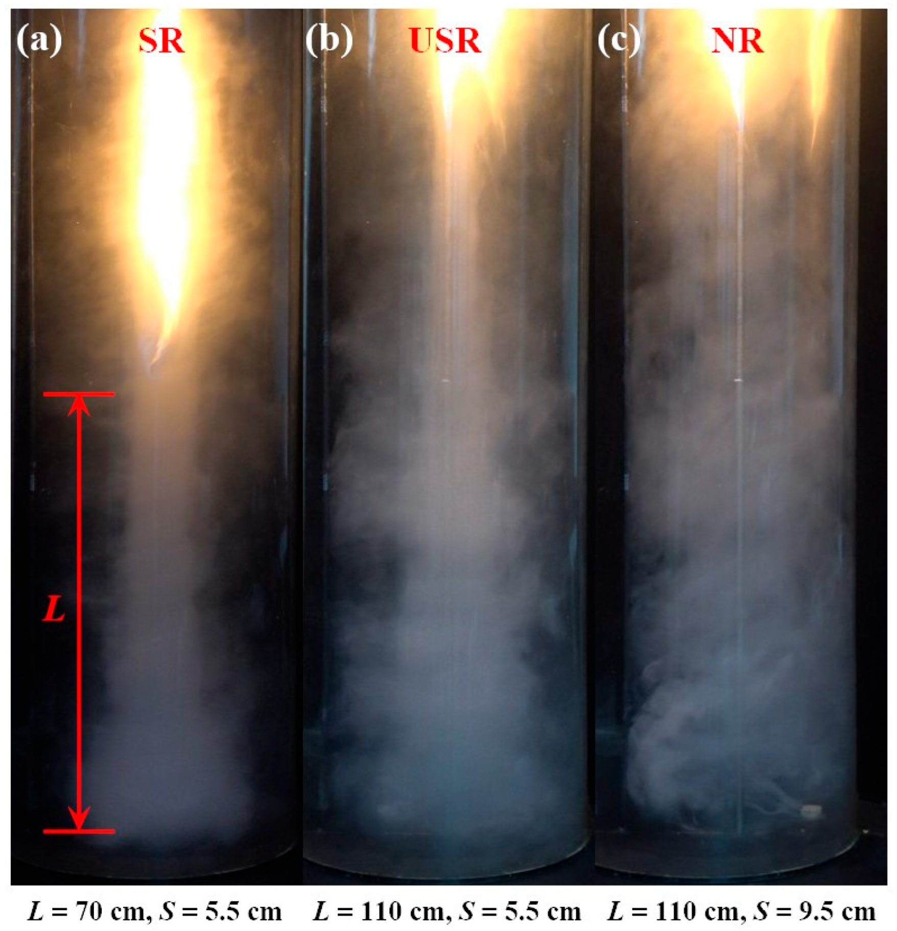 - Lei, J.; Liu, N.; Zhang, L.; Chen, H.; Shu, L.; Chen, P.; Deng, Z.; Zhu, J.; Satoh, K.; de Ris, J.L. Experimental research on combustion dynamics of medium-scale fire whirl. Proc. Combust. Inst. 2011, 33, 2407–2415. [Google Scholar] [CrossRef]