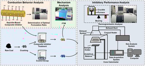 In response to the prevalent issues of short inhibition cycles and poor environmental compatibility in traditional inhibitors, this study prepared a new sepiolite-based composite inhibitor by loading imidazolium ionic liquid onto sepiolite. Through TG-DTG analysis, cone calorimeter experiments, and FTIR spectroscopy, we comparatively investigated the combustion characteristics of the composite inhibitor and its effects on the oxidation properties, inhibition performance, and active functional groups of coal samples. The results demonstrate that appropriate loading optimizes the thermal stability of sepiolite. Compared with conventional inhibitors, the composite exhibited the minimum weight loss rate at characteristic temperatures and achieved greater delays in critical temperature points of coal samples. The composite inhibitor delayed ignition time by 27–44 s compared to conventionally inhibited coal. The 3% [BMIM][BF4]/sepiolite formulation showed CO emission peak intensity 3.02 times that of raw coal within 0–200 s, while reducing CO2 production rate by 10.56% compared to MgCl2-treated samples at 1000 s. The PPFI exhibited maximum enhancement. Post-inhibition analysis revealed a 22–51% reduction in peak areas of active functional groups, indicating that the sepiolite-based composite achieves inhibition through synergistic physical and chemical interactions. Ultimately, a sepiolite-based composite inhibitor with environmental benignity was developed, whose inhibition performance is significantly enhanced compared to the traditional inhibitor MgCl2. This research provides theoretical foundations for developing advanced inhibitor materials in coal mine applications.