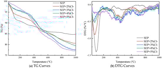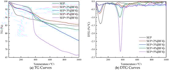The TG curves in Figure 3 elucidate the regulatory effects of IL modification on the thermal stability of SEP. After IL treatment, the modified samples exhibited significantly reduced mass loss in the 100–300 °C range. Specifically, SEP + 3% Cl− and SEP + 5% Cl− showed mass losses of only 4.8% and 3.2%, respectively, indicating that ILs effectively suppressed the thermal desorption of water molecules by occupying interlayer domains within the clay mineral structure. In the high-temperature regime (200–900 °C), the residual mass progressively decreased with increasing IL loading, attributed to the stepwise thermal decomposition of loaded [BMIM][Cl] above 300 °C, with decomposition spanning 280–450 °C. Data confirm that moderate loading (3–5% Cl−) enhances thermal stability while avoiding secondary decomposition effects caused by excessive organic components. The incorporation of ILs markedly altered the thermal response characteristics, as evidenced by systematic shifts in DTG peak positions: modified samples exhibited new decomposition peaks in the 435–450 °C range (SEP + 2% Cl−: 450 °C; SEP + 3% Cl−: 435 °C; SEP + 4% Cl−: 445 °C; SEP + 5% Cl−: 449 °C), corresponding to the thermal degradation of the imidazolium ring in [BMIM][Cl]. The temperature variations correlate with interfacial interaction strength between ILs and SEP. Quantitative DTG peak analysis revealed a 61% reduction in peak intensity for SEP + 5% Cl− within 100–200 °C compared to pristine SEP, confirming that ILs effectively inhibit zeolitic water release by occupying interlayer spaces. Based on experimental results, two optimized formulations SEP + 3% [BF4]− and SEP + 5% Cl− were selected as the primary systems for subsequent investigations.