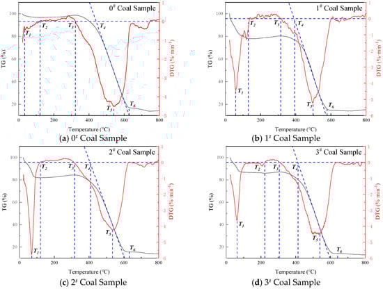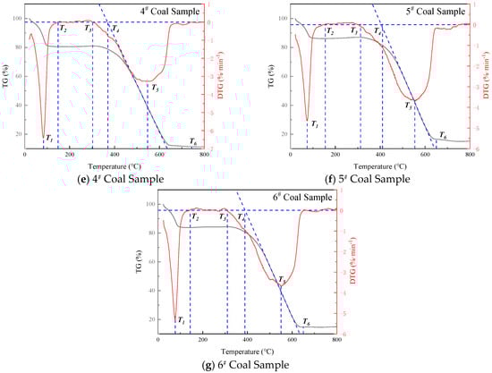 Based on characteristic temperature parameters, the coal oxidation process can be divided into four distinct stages: dehydration and weight loss stage (T1–T2); oxygen absorption and weight gain stage (T2–T3); pyrolysis activation stage (T3–T4); and combustion reaction stage (T4–T6). These characteristic temperature parameters serve as kinetic indicators for coal–oxygen complex reactions, quantitatively characterizing the spontaneous combustion propensity of coal matrices. Table 4, compiled based on the data from Figure 3, comparatively presents the differential distribution of characteristic temperature parameters among various coal samples in the thermogravimetric analysis (TGA).