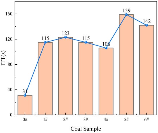 The ignition time threshold (ITT), characterizing the time interval from spark application to sustained flame formation under standardized heat flux conditions, exhibits an inverse correlation with material flammability. A comparative analysis of ignition characteristics between raw coal and inhibited coal samples, as illustrated in Figure 5, demonstrates the significant prolongation of ignition delay time in treated samples, confirming the effective suppression of initial ignition processes by inhibitors. Post-ignition combustion phenomena for each coal sample are depicted in Figure 6. As can be seen from Figure 6, the raw coal exhibits a vigorous flame state at the moment of ignition, while the coal samples treated with the composite inhibitor show a weak flame state.
