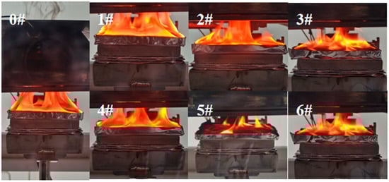 Post-ignition combustion phenomena of each coal sample. (0#: Raw Coal, 1#: 20%-MgCl2, 2#: 10%-SEP, 3#: 5%-[BMIM][BF4], 4#: 5%-[BMIM][Cl], 5#: 10%-SEP + 3% [BF4]−, 6#: 10%-SEP + 5% [Cl]−).
