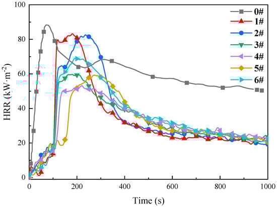 As evidenced by Table 5, the peak time of Inhibited Coal Sample 5# is delayed to 276 s, representing the maximum delay compared to raw coal. This confirms that the synergistic effects of multi-component inhibition systems enhance combustion suppression efficacy. The peak heat release rate (PHRR) of the six inhibited coal samples exhibits a reduction range of 5.0–39.8% relative to the raw coal baseline value of 88.17 kW·m−2. Among these, Inhibited Coal Sample 4# demonstrates optimal flame-retardant performance, with its PHRR reduced to 53.03 kW·m−2 (a 39.8% decrease). Comparative studies reveal that the PHRR of Inhibited Coal Sample 5# in the sepiolite-based composite system is 14% lower than that of Sample 6#. This discrepancy stems from improved free radical quenching efficiency due to differences in surface active site density, confirming that the structural optimization of the carrier significantly influences combustion intensity modulation.