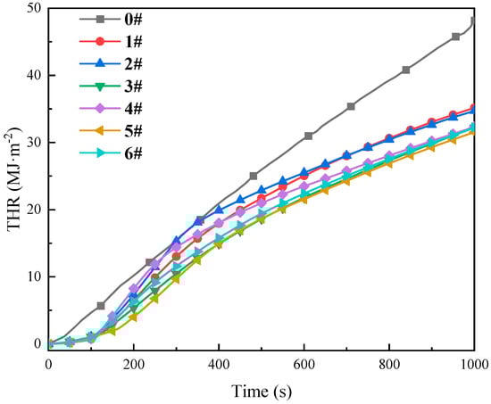 Figure 8 illustrates THR variation curves for different coal samples. Thermodynamic analysis from Figure 8 and Table 5 demonstrates that Inhibited Coal Sample 5# exhibits significant heat release suppression efficacy at t > 100 s, with its THR reduced by 32.03% compared to raw coal 0#. The final stabilized THR value of 32.74 MJ·m−2 represents the lowest level among all experimental groups. This sample maintains a 14.8% greater heat release suppression differential than the other five inhibition systems, confirming that its layered structure-loaded system achieves the profound modulation of combustion energy release through dual mechanisms of physical barrier effects and chemical bonding interactions.