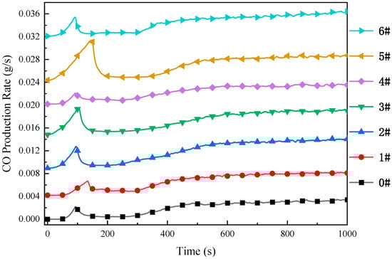 As shown in Figure 9, raw coal 0# exhibits significant fluctuations in CO generation rate during the 0–100 s interval, with its peak corresponding to intense volatile matter release. From 100 to 1000 s, the CO generation rate transitions into a dynamic equilibrium state. This phenomenon originates physically from heat accumulation effects caused by excessive coal packing density, which induces restricted oxidation reactions of underlying fuels under oxygen-deficient pyrolysis conditions, forming diffusion-limited combustion kinetics. All six inhibited coal samples significantly enhance CO generation intensity. Notably, Inhibited Coal Sample 5# demonstrates a characteristic CO emission peak during the 0–200 s interval, with an instantaneous intensity reaching 3.02 times the baseline value of raw coal. This confirms that the composite inhibition system alters coal–oxygen reaction pathways via selective chemisorption, preferentially directing combustion toward incomplete oxidation channels favoring CO production. Furthermore, Sample 5# maintains a higher CO generation rate than raw coal throughout the 200–1000 s phase, revealing the porous carrier structure’s persistent interference with free radical chain reactions.