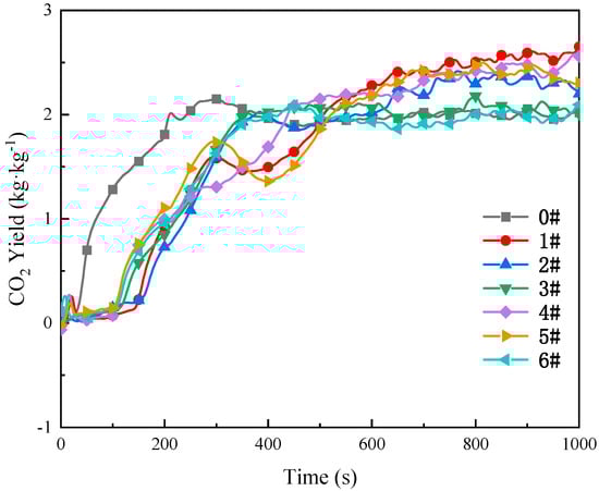 The CO2 yield curves for different coal samples are shown in Figure 10. Raw coal 0# exhibits a continuous increase in CO2 yield during the 0–300 s interval, followed by stabilization between 300 and 1000 s. In contrast, all inhibited coal samples demonstrate significantly lower CO2 yields than raw coal during the initial 0–300 s phase, indicating the effective suppression of combustion by various inhibitors. Notably, Inhibited Coal Sample 2# shows the lowest CO2 yield of between 200 and 300 s of 0.87 kg·kg−1, highlighting the primary inhibition capability of SEP in this critical timeframe. Between 300 and 550 s, certain inhibited samples (2#, 3#, 4#, and 6#) exhibit CO2 yields exceeding raw coal levels. This phenomenon arises from the deactivation of single-component inhibition systems post 400 s, leading to partial combustion recovery. Specifically, Sample 6# fails to achieve anticipated synergistic effects due to insufficient interfacial compatibility between SEP and [BMIM][Cl]. A comparative analysis reveals that both Samples 1# and 5# surpass raw coal in CO2 yield after 550 s. However, by the terminal 1000 s, Sample 5# achieves a CO2 yield of 2.64 kg·kg−1, representing a 13.2% reduction compared to Sample 1#. These results conclusively demonstrate that the composite inhibitor system of SEP loaded with 3% [BMIM][BF4] delivers optimal combustion inhibition performance.