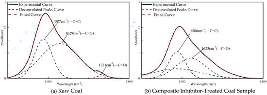 Given the complex chemical composition of coal and the convoluted nature of its FTIR spectra, three characteristic spectral regions were selected for analysis, 1500–1800 cm−1, 2800–3000 cm−1, and 3200–3700 cm−1, corresponding to distinct coal functional groups, as specified in Table 6. A peak deconvolution analysis of coal sample FTIR spectra was performed in Origin software, yielding the following conclusions.