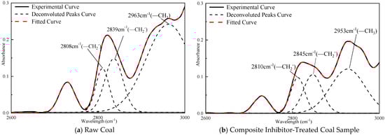 FTIR absorption spectra in the 2600–3000 cm−1 region: raw coal (a) vs. composite-inhibitor-treated coal sample (b).
