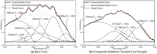 FTIR absorption spectra in the 3200–3700 cm−1 region: raw coal (a) vs. composite-inhibitor-treated coal sample (b).