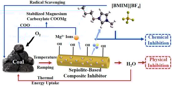 Schematic diagram of the inhibition mechanism of sepiolite-based composite inhibitor on coal.