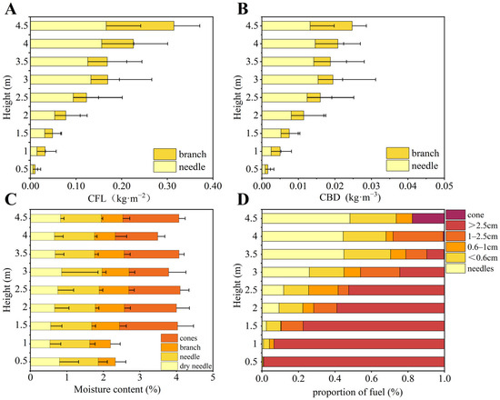 Figure 3C illustrates the vertical distribution of moisture content within the tree canopy. The moisture content in cones exhibits the highest values, ranging from 110% to 160%. The cones begin to emerge at a height of 1–1.5 m. The error bars for moisture content were relatively large at both the 1–1.5 m and 2.5–3 m intervals, indicating significant variability in moisture content among individual cones within this range. The moisture content of the needles exhibits minimal variation across the different layers and remains relatively stable overall, fluctuating within a range of 110%. The moisture content of branches is lower than that of needles and cones, exhibiting a significant variation in moisture content across different layers. The moisture content exhibits the lowest value of 47% in the 0–0.5 m layer, while it reaches a maximum of 81% in the 2–2.5 m layer. Furthermore, minimal variation can be observed among the different layers. The moisture content of dry leaves is relatively low and exhibits minimal variation with height, predominantly concentrating at 70%. The variability in dry leaf moisture content across different layers is greater than that observed in the other three types, particularly at layers of 0–0.5 m, 2–2.5 m, and 2.5–3 m. In these ranges, the dry leaf moisture content exhibits variations among the individual samples.