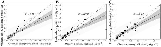 Plots of the observed versus predicted values of available canopy biomass, CFL, and CBD. The solid line represents the linear model fitted to the scatter plot of data, and the broken line is the 1:1 line. (A) Comparison chart of the observed and predicted values of the canopy’s available biomass. (B) Comparison chart of observed and predicted values of canopy fuel load. (C) Comparison chart of the observed and predicted values of canopy bulk density.