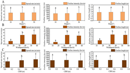 Least significant difference (LSD) post-comparison chart of slope, wind speed, and CBH effects on fire behavior. (A) The variations in the fire’s rate of spread, fireline intensity, and flame length across different slopes. (B) The variations in the fire’s rate of spread, fire line intensity, and flame length across different wind speeds. (C) The variations in the fire’s rate of spread, fire line intensity, and flame length across different values of CBH.