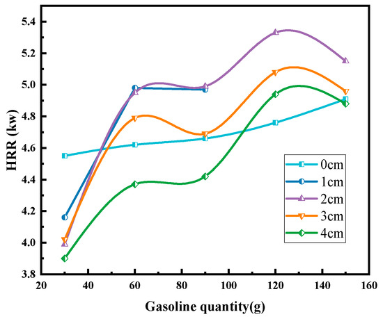 Figure 4 analysis reveals that heat release rate HRR exhibits an increasing trend with fuel loading. However, the HRR demonstrates discontinuous variation with quartz sand layer thickness. This behavior arises from the concurrent influence of ambient temperature, fuel quantity, and sand layer thickness on the HRR. To further examine the relationship between the combustion source HRR and sand layer thickness, normalization analysis was performed by nondimensionalizing both parameters. The heat release rate of the combustion source is expressed as follows [21]: