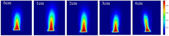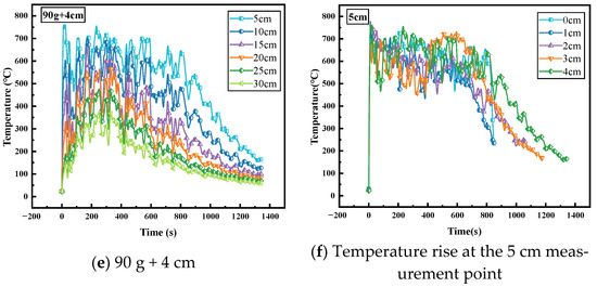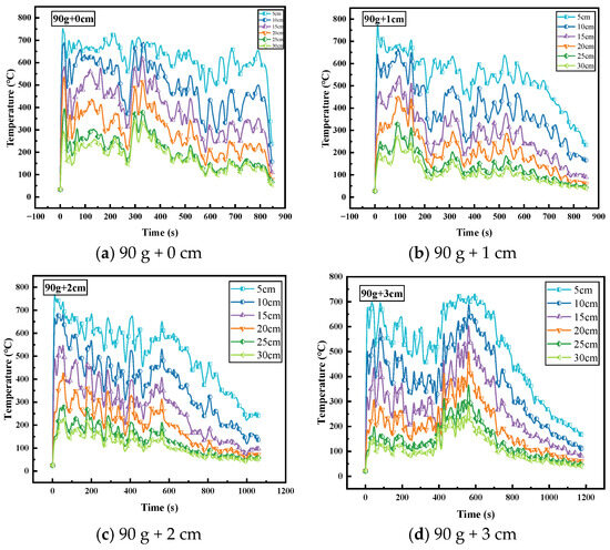 Figure 6 demonstrates the significant influence of quartz sand layer thickness on flame plume temperature distribution for 90 g gasoline combustion. Without a sand layer, the temperature profile exhibits characteristic medium-scale pool fire behavior: temperature rises rapidly from the flame root, peaks at Z = 10–15 cm ≈ 756 °C, and subsequently decays due to increased entrainment of ambient air. This peak region corresponds to the continuous flame zone of maximum reaction intensity. Temperature decay follows classical plume theory, governed by the balance between combustion-generated buoyancy and entrained air inertia. Introduction of quartz sand layers reduces flame temperatures across all conditions, with suppression magnitude proportional to sand thickness. This attenuation arises from the coupling of three physical mechanisms: (1) Energy Partitioning: The porous media acts as a thermal mass, absorbing significant combustion energy that would otherwise heat fuel/air mixtures. This energy increases sand particle temperatures, reducing net energy available for gas-phase combustion and directly lowering flame temperatures. (2) Reduced mass loss rate: As established in Section 3.1, sand layers decrease the MLR during stable combustion. Reduced fuel supply per unit lowers the heat release rate HRR, inherently producing lower-temperature flames. (3) Altered Flame Root Dynamics: Sand layers disrupt air entrainment patterns at the flame base. Compared to smooth liquid pool fires, surface roughness and localized fuel vapor leakage through porous media create suboptimal fuel/air mixing ratios, reducing combustion efficiency and temperature.