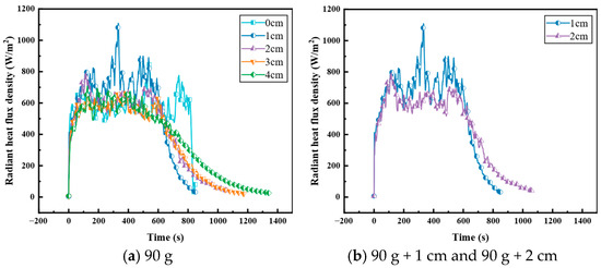 The radiative heat flux data presented in Figure 7 corroborates the preceding analysis. The overall trend closely tracks both the MLR and plume temperature profiles. Notably, under 1 cm and 2 cm quartz sand layer conditions in an oil-bubble sand configuration, significant radiative heat fluctuations occur during early combustion stages. These fluctuations align precisely with the previously discussed splashing phenomenon, where ejected high-temperature droplets or sand particles transiently approach the heat flux meter, inducing instantaneous signal peaks. To enable direct cross-comparison of plume temperatures across experimental conditions, temperature rise values were normalized. The dimensionless temperature rise is defined as [23]: