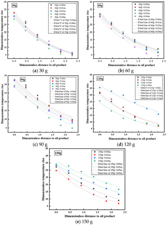 Fit the data of each operating condition to obtain the relationship between dimensionless temperature rise and dimensionless distance from the oil pan, as shown in Figure 8.