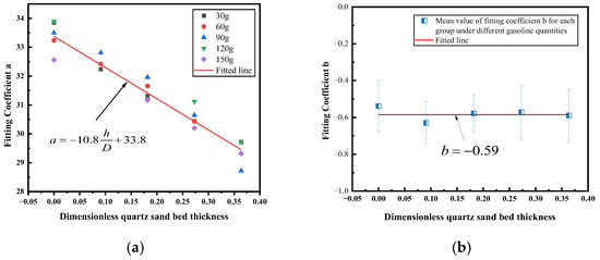 To investigate the effect of dimensionless sand layer thickness on plume temperature, the fitting coefficients a and b were fitted to the dimensionless sand layer thickness, and the fitting curves are shown in Figure 9.